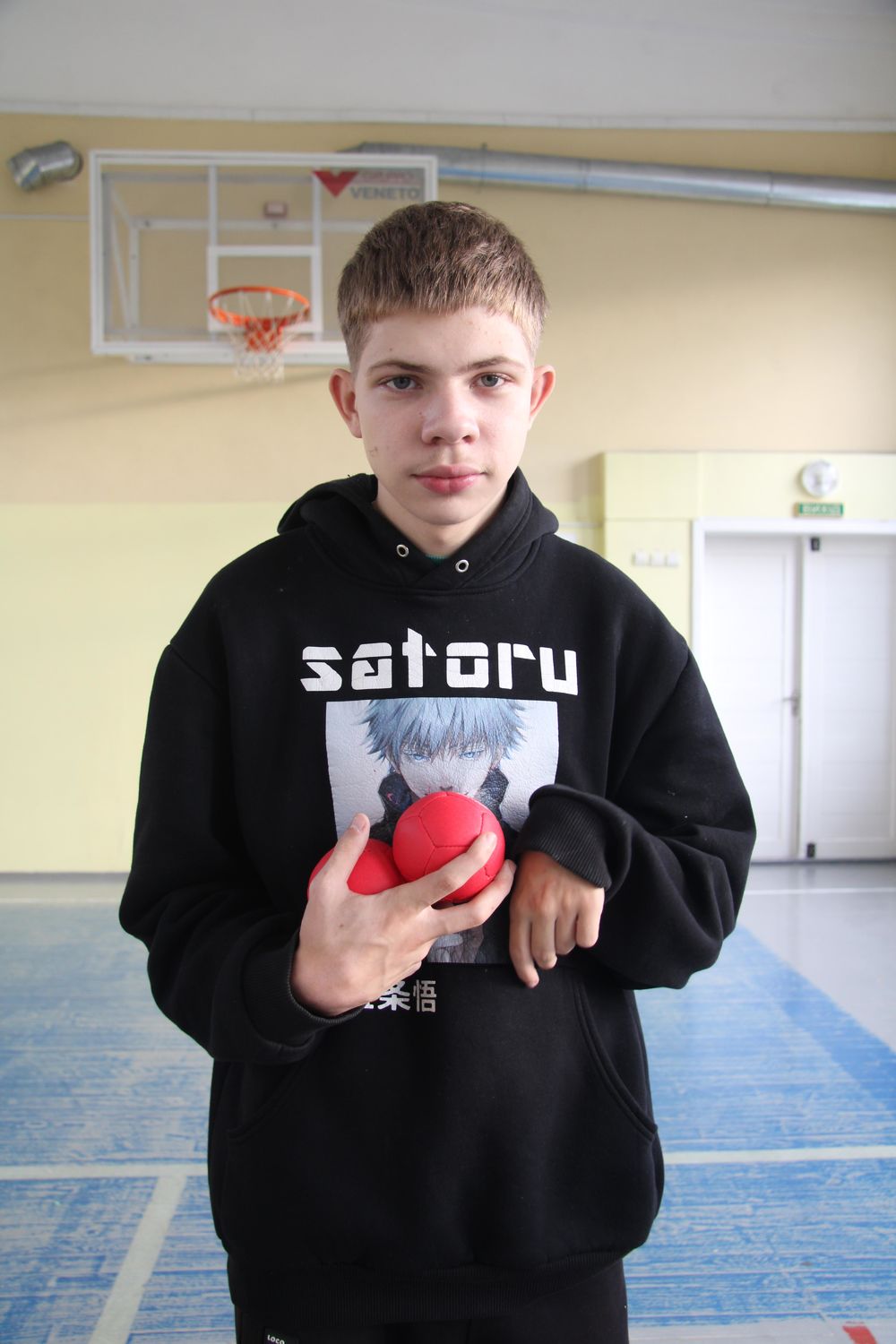 På banen står 15 år gamle Artem, som smiler bredt når laget hans vinner en boccia‑kamp.